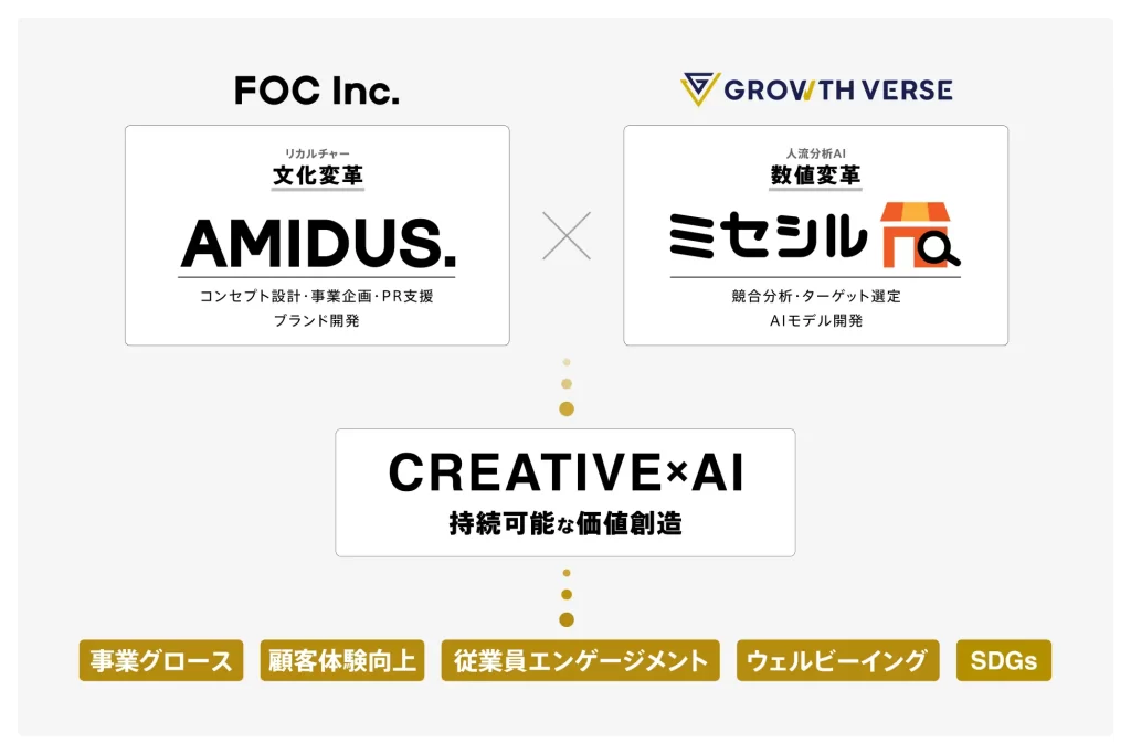 このように、データによる”数値的な変革”と、デザインによる”人の意識・文化の変革”という両輪を揃えることで、持続的な成長を実現します。FOCとGROWTH VERSEは、双方の強みを掛け合わせ、お客様の事業成長を力強く支援する革新的なソリューションを提供します。